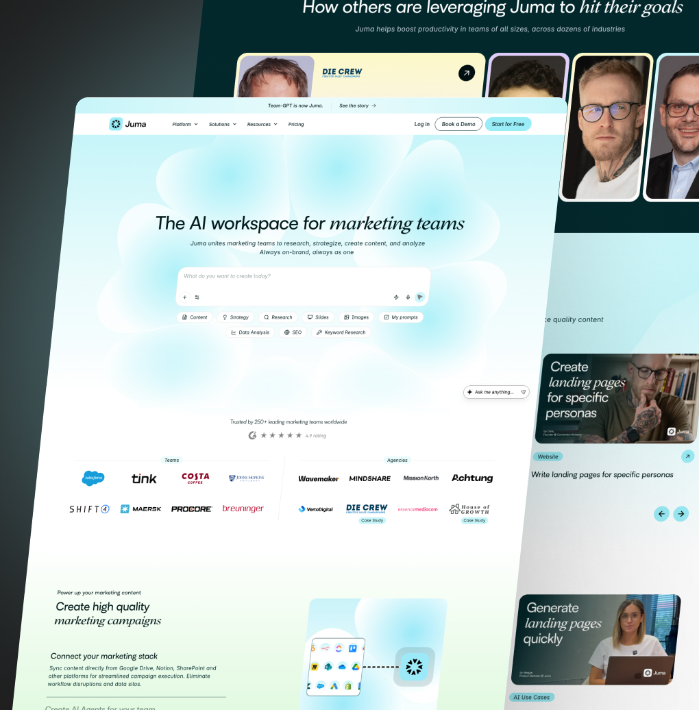 Juma is an AI collaborative platform that helps mid-sized marketing teams scale by producing high quality, on-brand content using their company's unique knowledge and data. We migrated 210+ pages from WordPress to Webflow in 40 days with zero SEO loss. This site includes 30+ reuseable components, enabling the team to launch new pages and campaigns without developer support.